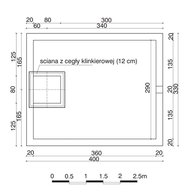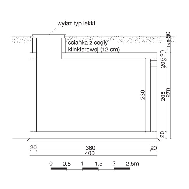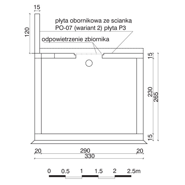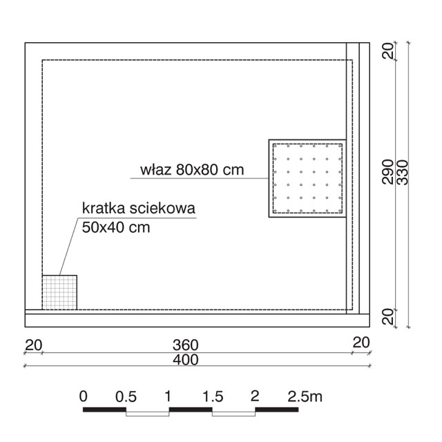 zbiornik podziemny, monolityczny, żelbetowy, przykryty stropem wytrzymującym obciążenie ciężkiego sprzętu rolniczego (2,5 tony na jedno koło). Przeznaczony do zbierania i przechowywabnia gnojówki spływającej do niego z budynków inwentarskich, a także wód gnojowych z płyty obornikowej.