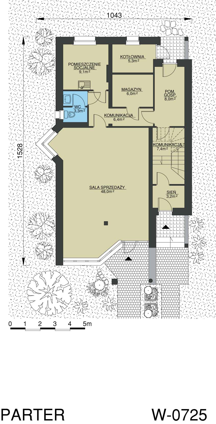 Efektowny parterowy dom z poddaszem mieszkalnym o interesującej, wysmakowanej architekturze. Powierzchnia parteru zaprojektowana została z myślą inwestorach, którzy zamierzają otworzyć własny sklep. Przeszklona część fasady świetnie się sprawdzi jako witryna sklepowa. Mieszkalne poddasze spełni wymagania trzy- lub czteroosobowej rodziny.