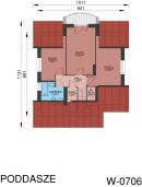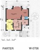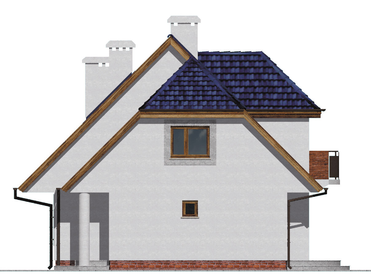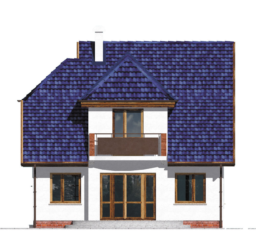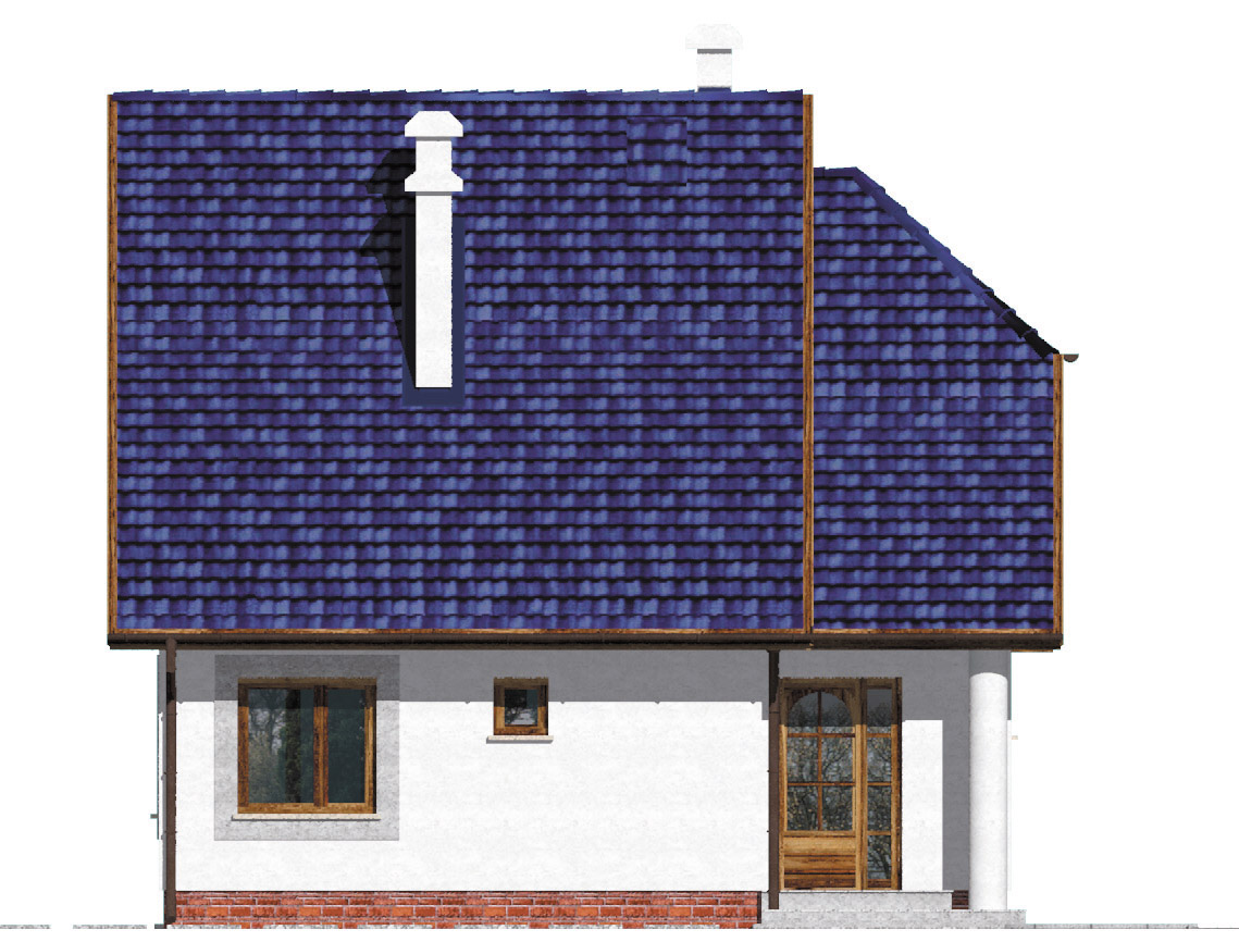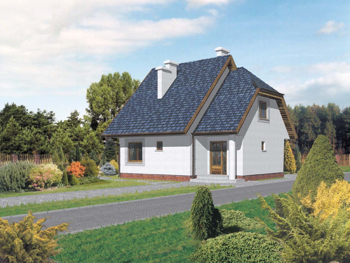 Dom parterowy o ciekawym wielospadowym dachu przekrywającym mieszkalne poddasze. Od strony ogrodowej duży półokrągły taras, który dodaje uroku domowi. Możliwość powiększenia salonu o powierzchnię sąsiadującego z nim gabinetu, albo przekształcenie go na dodatkową sypialnię. Projekt świetnie sprawdzi się w przypadku rodziny cztero-, pięcioosobowej.