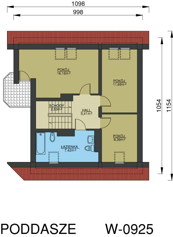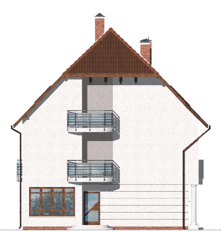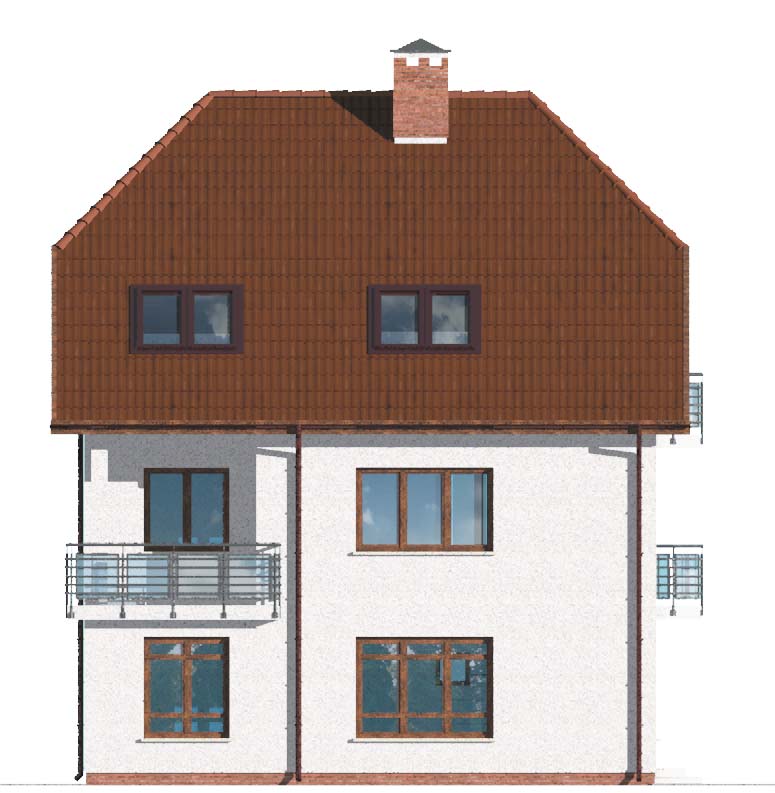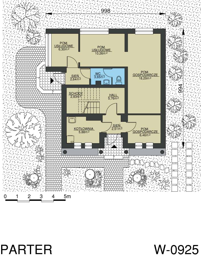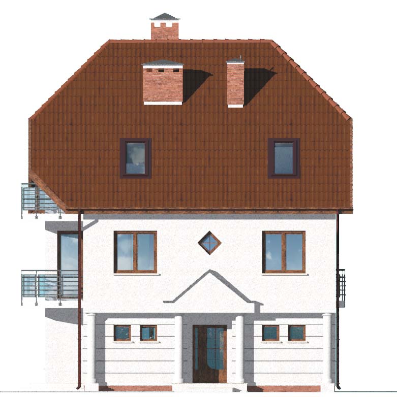 Masywny, piętrowy dom z mieszkalnym poddaszem. Ozdobnymi elementami domu jest boniowanie na wysokości parteru oraz fantazyjne trójkątne zwieńczenie nad wejściem frontowym. Osobne boczne wejście pozwala na swobodę prowadzenia działalności usługowej. Do dyspozycji inwestora są dwa pomieszczenia usługowe, duże pomieszczenie gospodarcze oraz niezależna toaleta. W domu zbudowanym według projektu W-0925 może zamieszkać czworo lub pięcioro domowników.